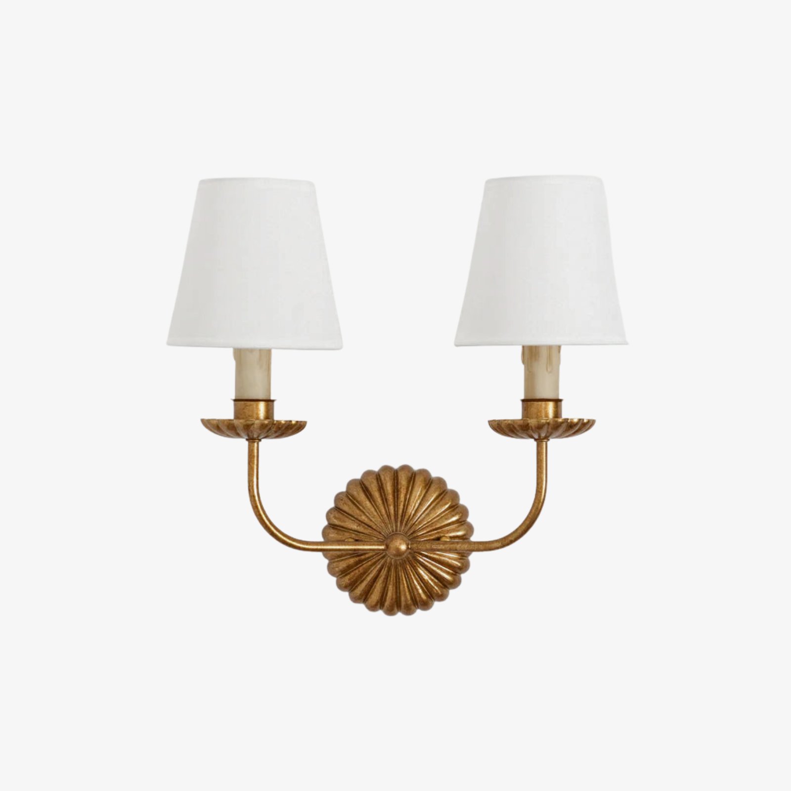 Die Augustine-Wandleuchte bringt ausgewogene Harmonie an Ihre Wände, inspiriert von der zeitlosen Eleganz klassischer Gestaltung. Zwei anmutige Arme erstrecken sich von einer wunderschön geriffelten Rückplatte und präsentieren ein Paar antik inspirierter Kerzen mit reichem Goldblatt-Finish. Gekrönt von klaren Stoffschirmen wirft diese Wandleuchte ein großzügiges, einladendes Licht, das sowohl großartig als auch anmutig modern wirkt.
