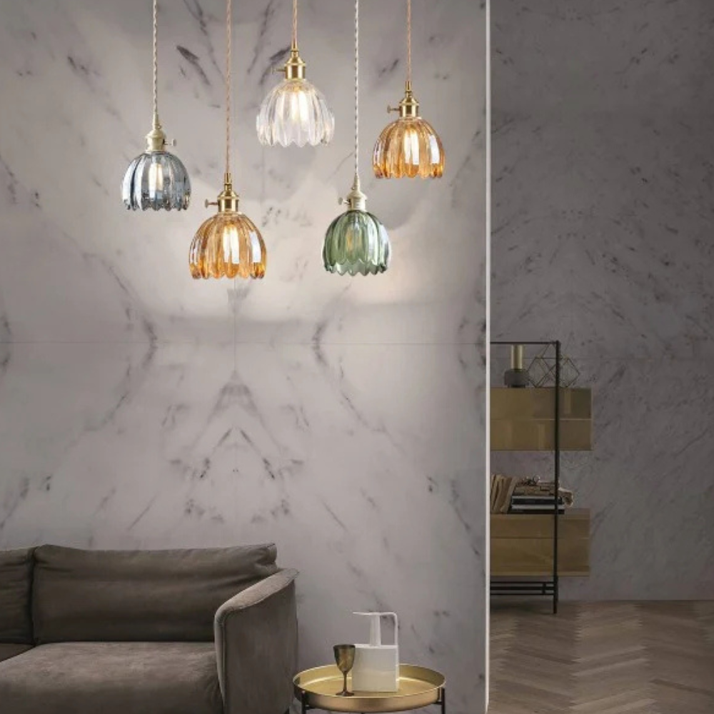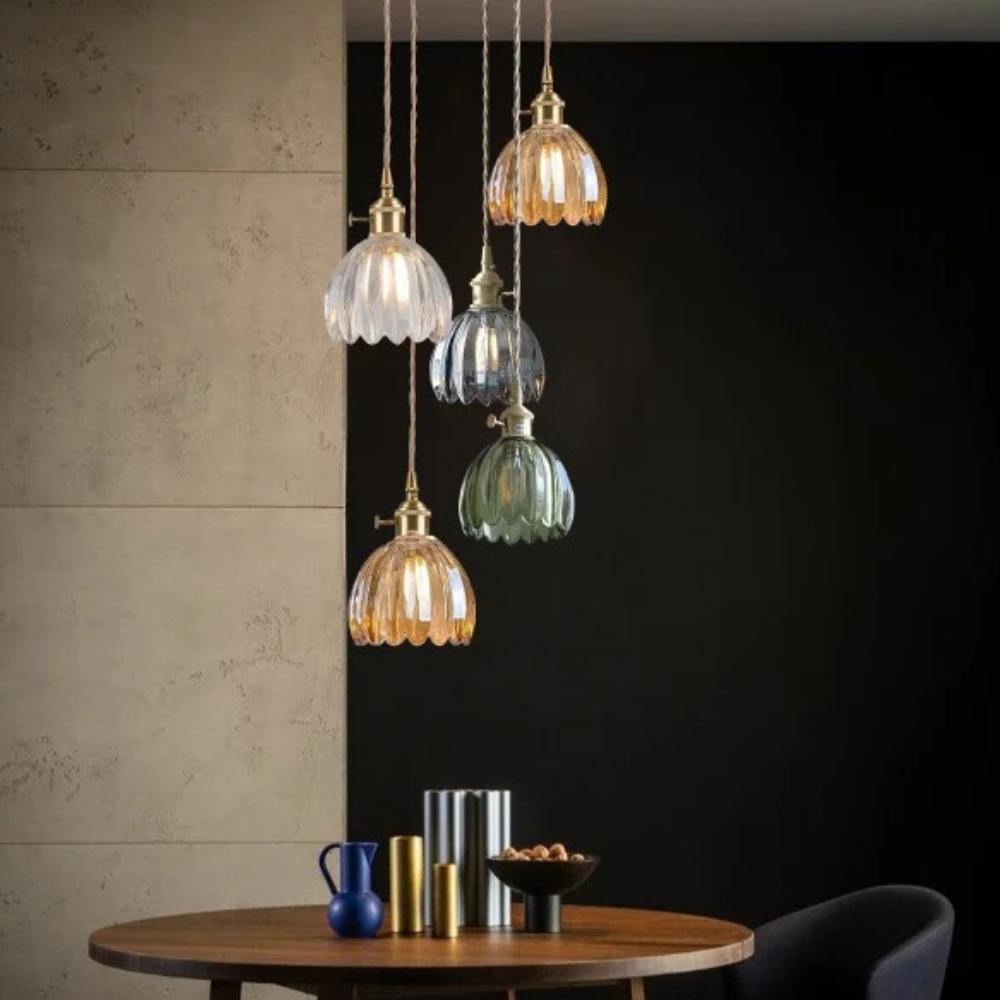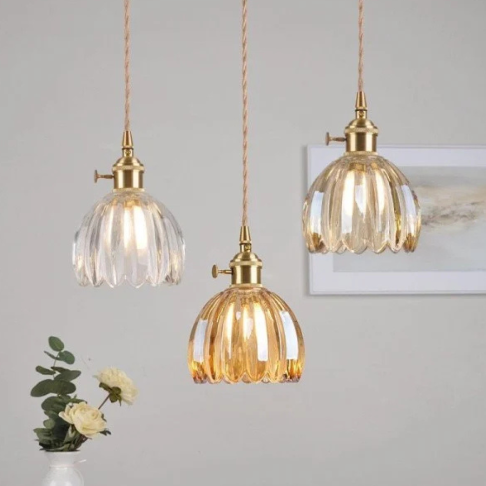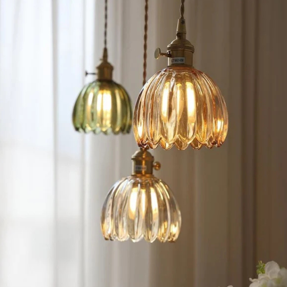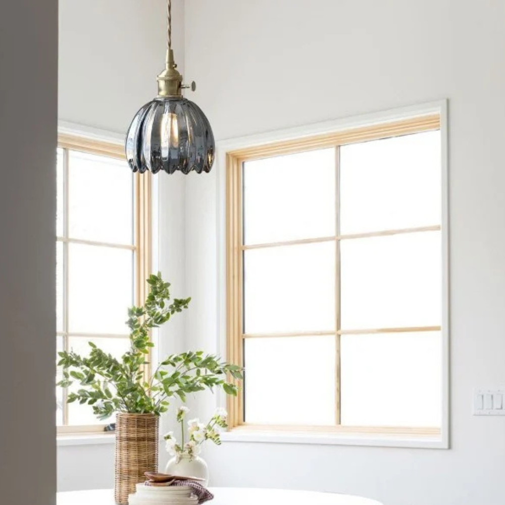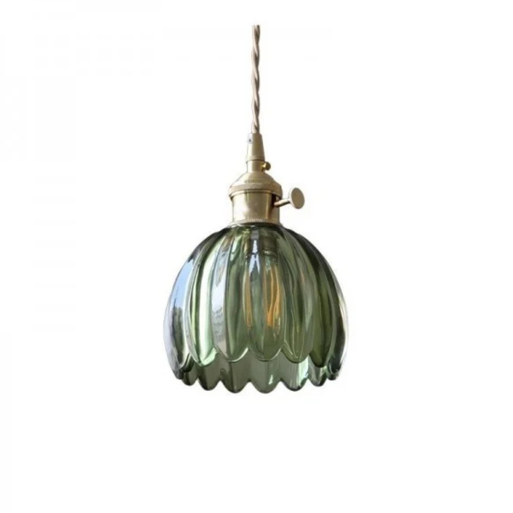 Diese Retro-Glaspendelleuchte bringt einen Hauch nostalgischen Charmes und raffinierten Mid-Century-Modern-Charakter an Ihre Decke. Der gezackte, blumeninspirierte Glasschirm erzeugt ein sanftes Lichtspiel, das das Erscheinungsbild jedes Raumes mildert und gleichzeitig funktionales Licht spendet. Sie verwandelt eine einfache Ecke in einen sorgfältig gestalteten Raum und bietet eine ästhetische Wirkung, die sowohl geschichtsträchtig als auch frisch wirkt.