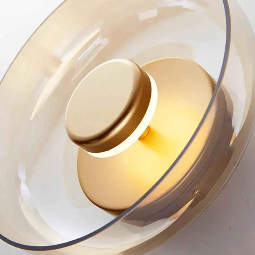 Geschichteter Halo-Glanz: Eine verdeckte LED wirft einen weichen, indirekten Lichtkranz auf die zentrale Metallscheibe und erzeugt einen anspruchsvollen Glanz ohne direkte Blendung.
