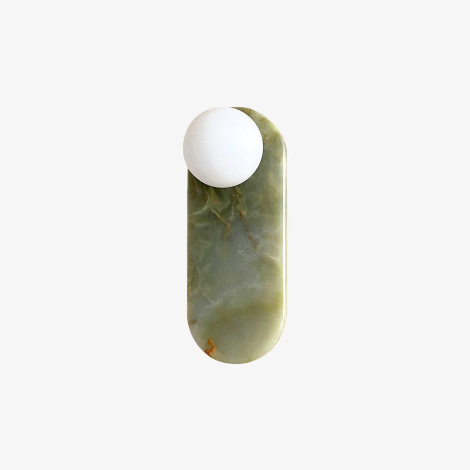 Die Pella Jade Wandleuchte vermittelt eine tiefe, natürliche Gelassenheit und verbindet organischen Luxus mit klarer, mid-century moderner Form. Eine leuchtende Glaskugel sitzt elegant auf einer soliden Rückplatte aus reinem, poliertem Jade, die für ihre einzigartige Transluzenz und beruhigenden Grüntöne geschätzt wird. Diese skulpturale Wandleuchte ist darauf ausgelegt, Ihren sorgfältig gestalteten Räumen ein Gefühl von ruhiger, geologischer Kunst zu verleihen.