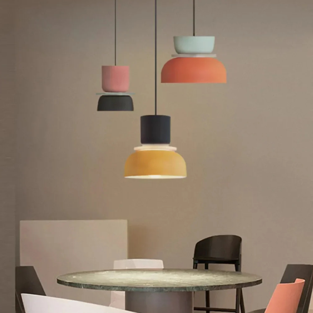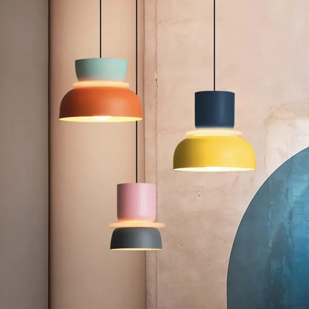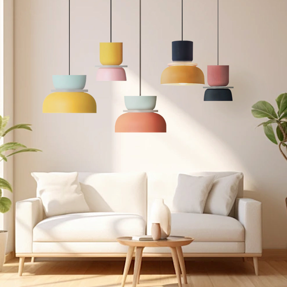 Verleihen Sie Ihrem Wohnraum eine verspielte, geometrische Energie, die von Mid-Century-Modern- und Memphis-Designbewegungen inspiriert ist. Diese mehrstufigen Pendelleuchten zeichnen sich durch eine kräftige Farbblock-Palette und eine gestapelte, skulpturale Form aus, die in jedem Raum einen fröhlichen Blickfang darstellt. Die lebendigen matten Oberflächen und klaren Linien verwandeln herkömmliche Deckenbeleuchtung in eine lebhafte Kunstinstallation, die sowohl die Stimmung als auch die Ästhetik eines zeitgenössischen Zuhauses aufhellt.