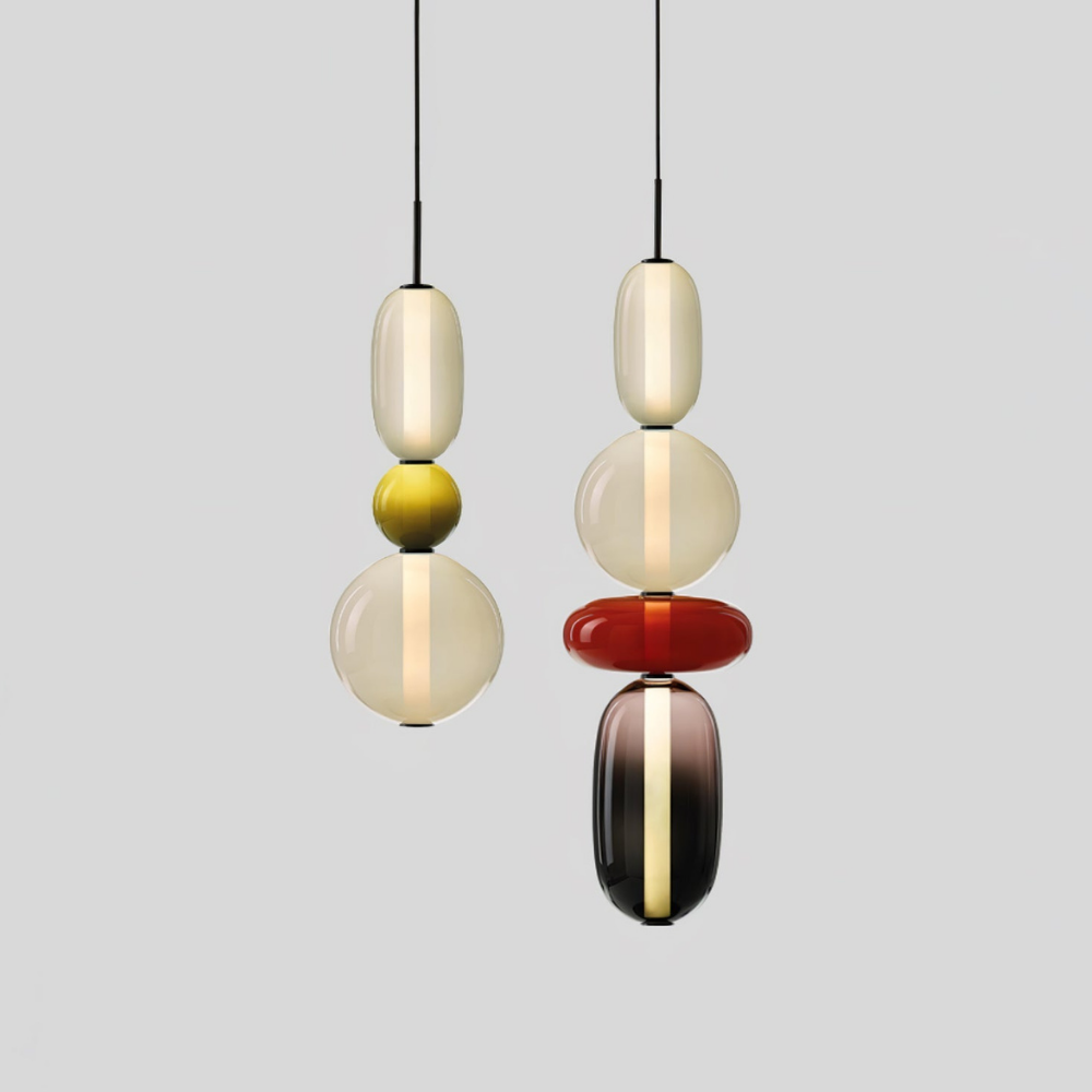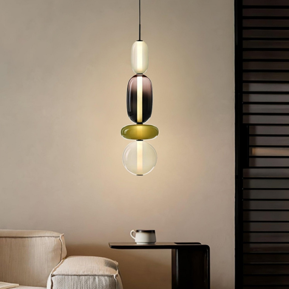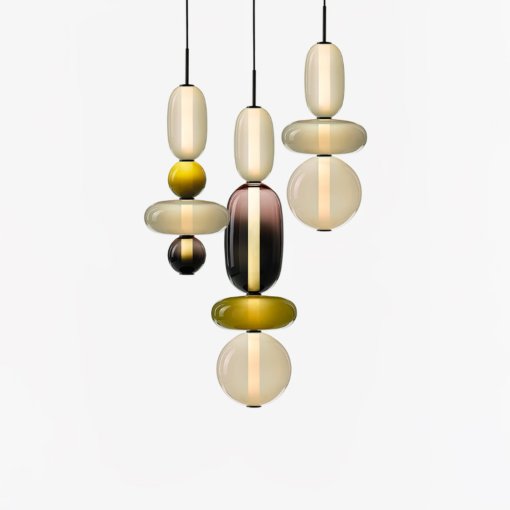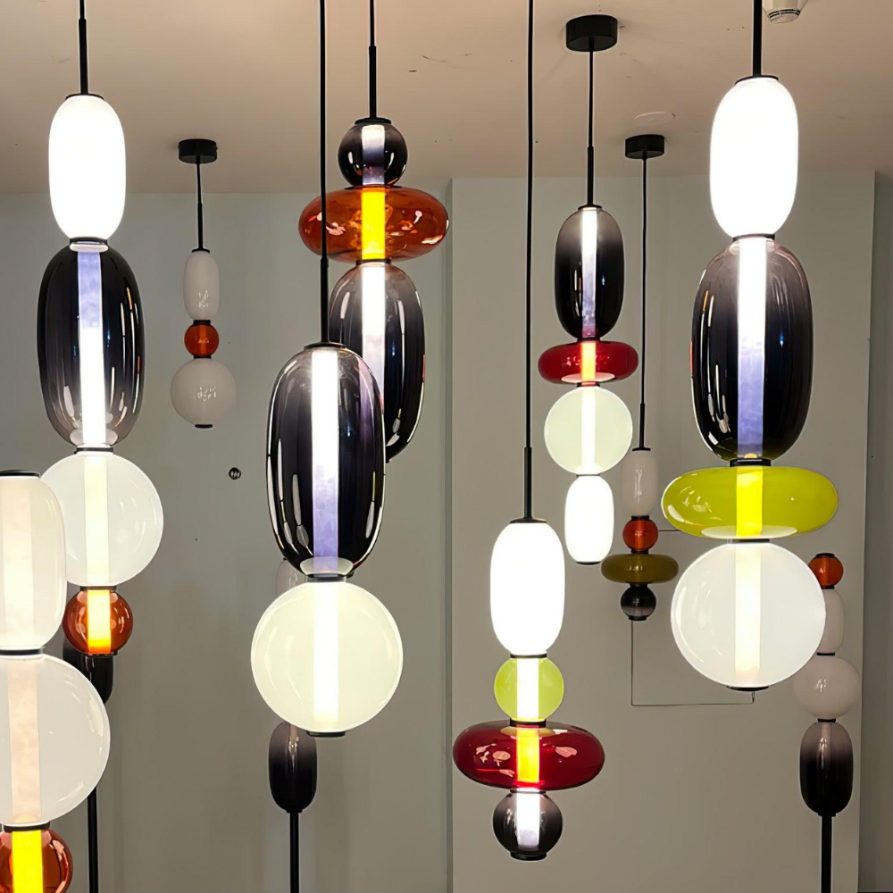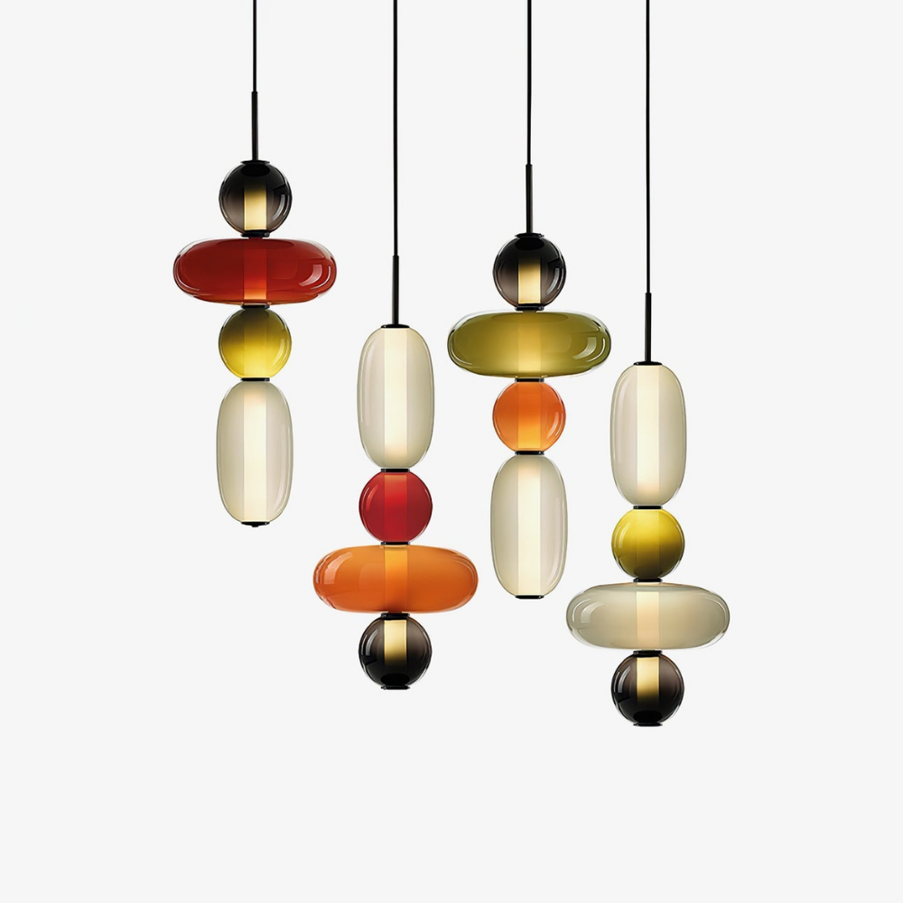 Bringen Sie einen Hauch von eleganter Art-déco-Energie in Ihr Zuhause mit diesen lebendigen, mehrstufigen Glastürmen, die als funktionaler Schmuck für Ihre Decke fungieren. Die gestapelten geometrischen Formen und verspielten Farbkombinationen schaffen eine markante vertikale Präsenz, die ein warmes und einladendes Licht ausstrahlt und jede gewöhnliche Ecke in ein sorgfältig gestaltetes Design-Statement verwandelt. Diese skulpturale Lichtlösung verbindet eine verspielte, moderne Ästhetik mit einem raffinierten Finish und ist damit die ideale Wahl für alle, die ihrem Interieur Persönlichkeit verleihen möchten.
