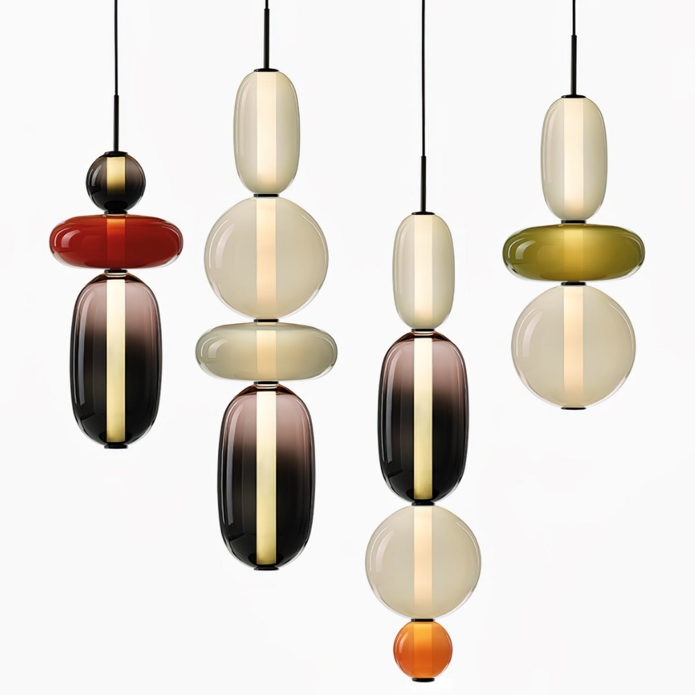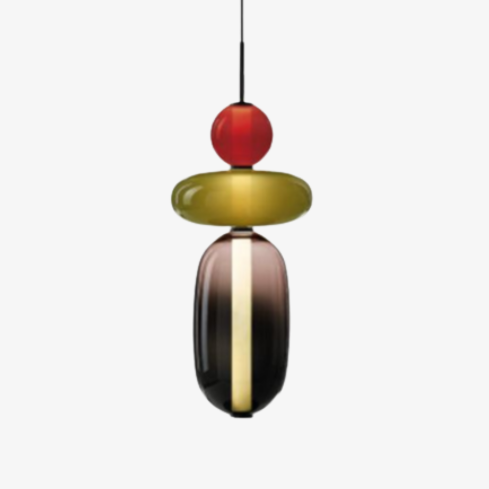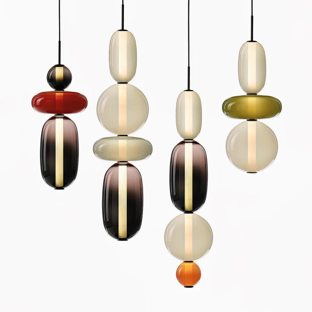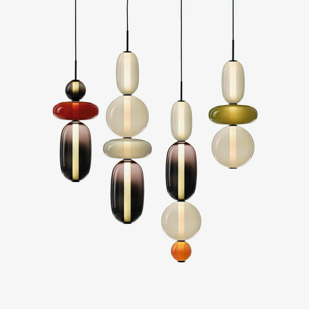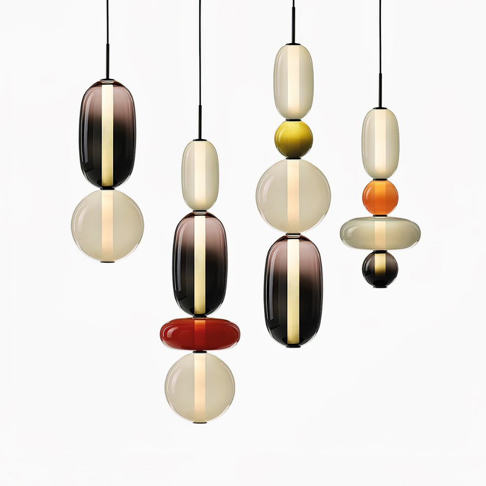 Bringen Sie einen Hauch von eleganter Art-déco-Energie in Ihr Zuhause mit diesen lebendigen, mehrstufigen Glastürmen, die als funktionaler Schmuck für Ihre Decke fungieren. Die gestapelten geometrischen Formen und verspielten Farbkombinationen schaffen eine markante vertikale Präsenz, die ein warmes und einladendes Licht ausstrahlt und jede gewöhnliche Ecke in ein sorgfältig gestaltetes Design-Statement verwandelt. Diese skulpturale Lichtlösung verbindet eine verspielte, moderne Ästhetik mit einem raffinierten Finish und ist damit die ideale Wahl für alle, die ihrem Interieur Persönlichkeit verleihen möchten.
