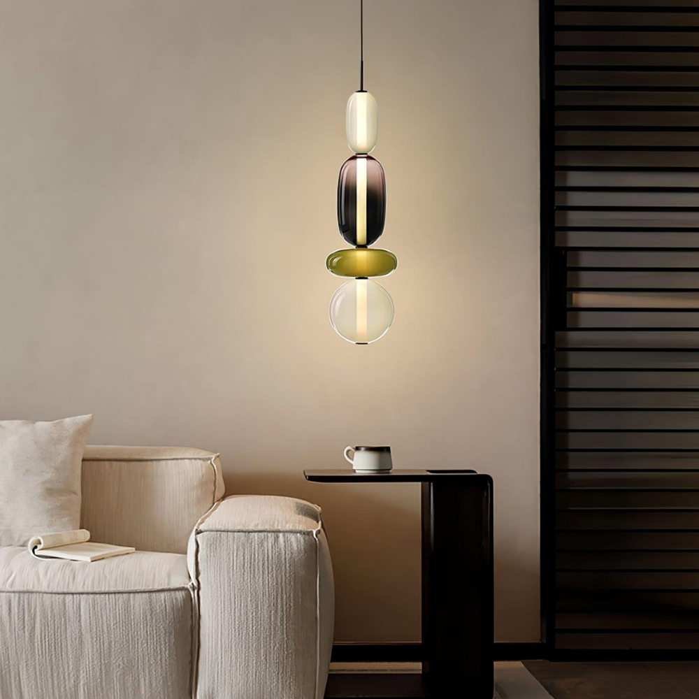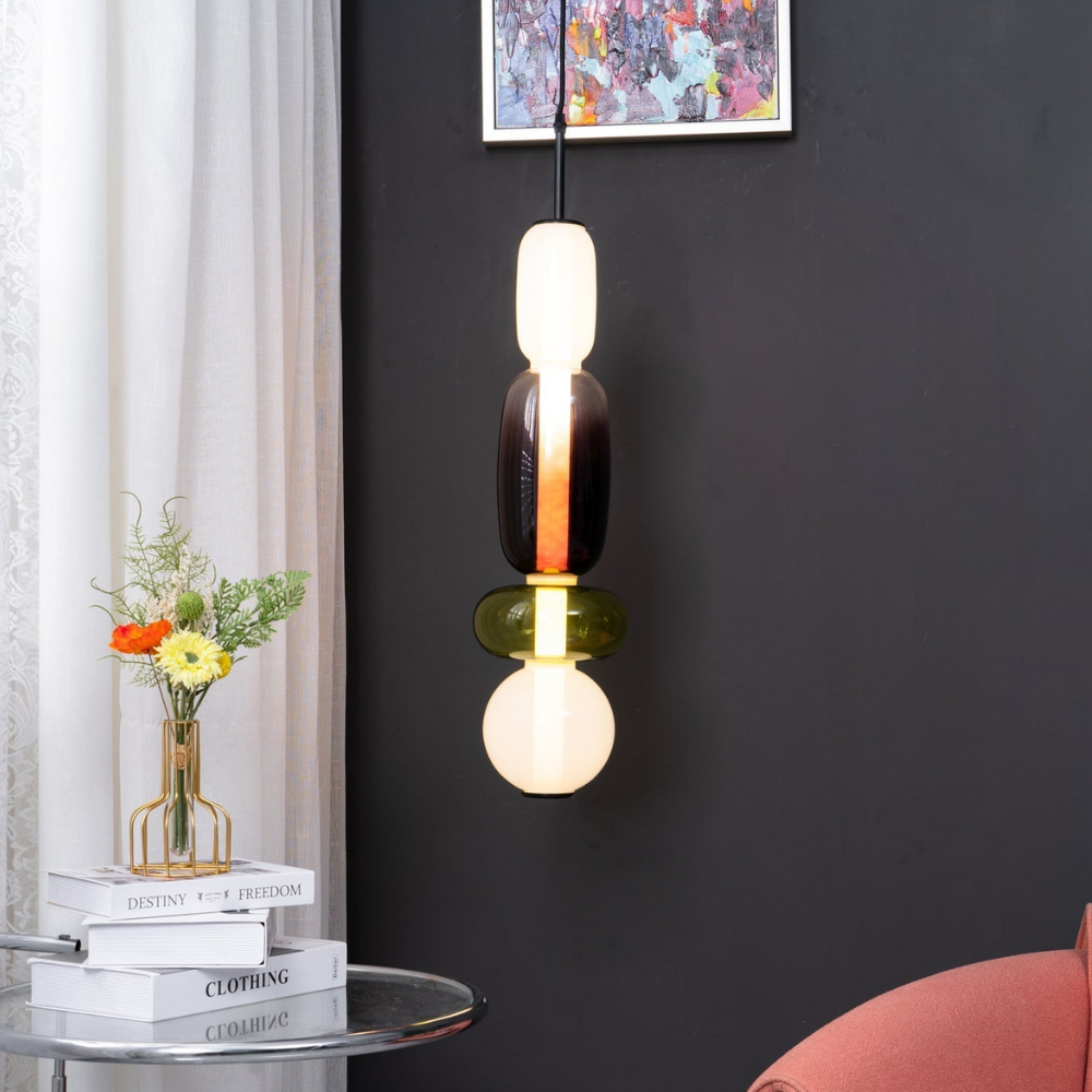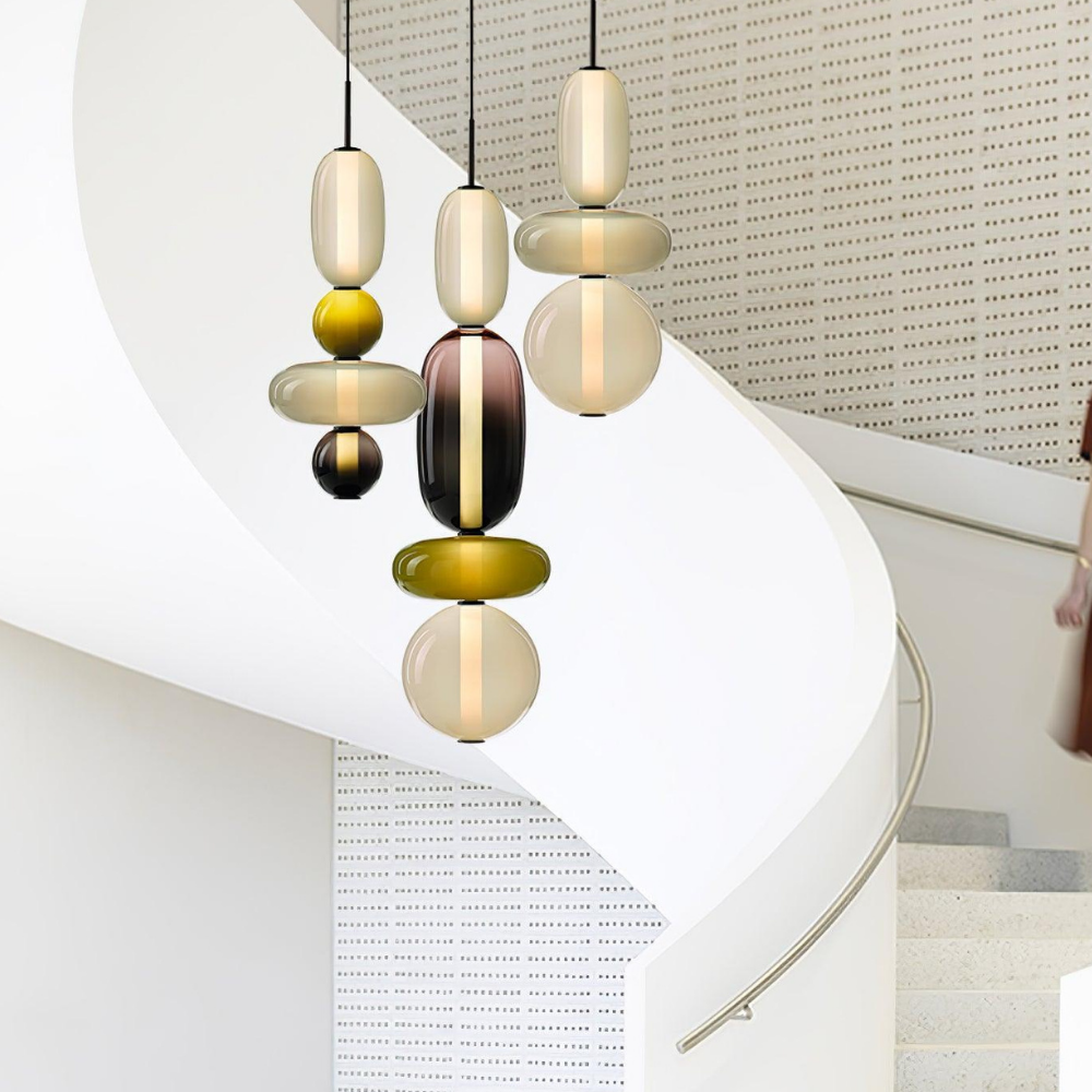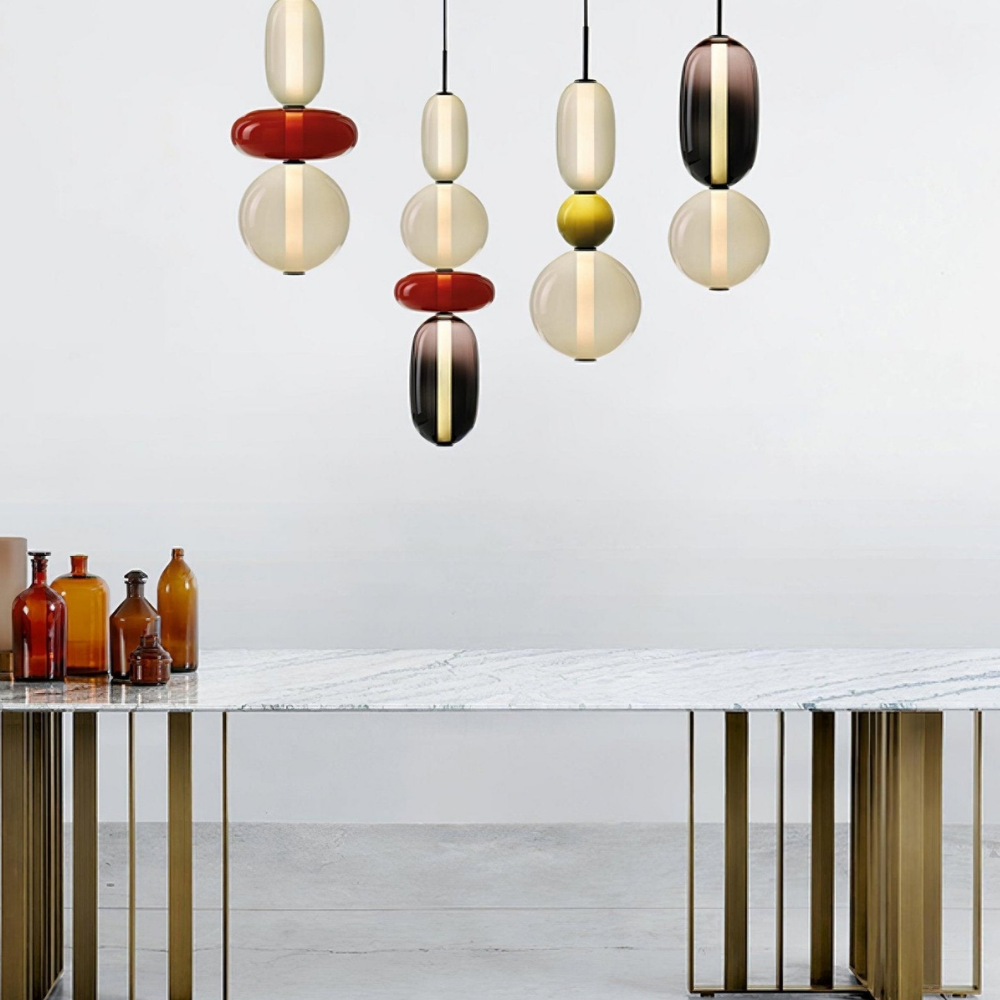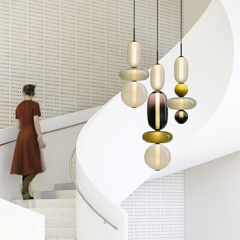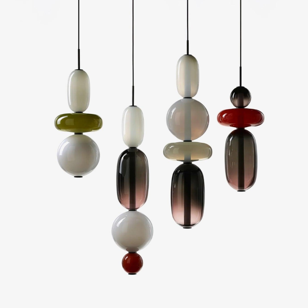 Bringen Sie einen Hauch von eleganter Art-déco-Energie in Ihr Zuhause mit diesen lebendigen, mehrstufigen Glastürmen, die als funktionaler Schmuck für Ihre Decke fungieren. Die gestapelten geometrischen Formen und verspielten Farbkombinationen schaffen eine markante vertikale Präsenz, die ein warmes und einladendes Licht ausstrahlt und jede gewöhnliche Ecke in ein sorgfältig gestaltetes Design-Statement verwandelt. Diese skulpturale Lichtlösung verbindet eine verspielte, moderne Ästhetik mit einem raffinierten Finish und ist damit die ideale Wahl für alle, die ihrem Interieur Persönlichkeit verleihen möchten.