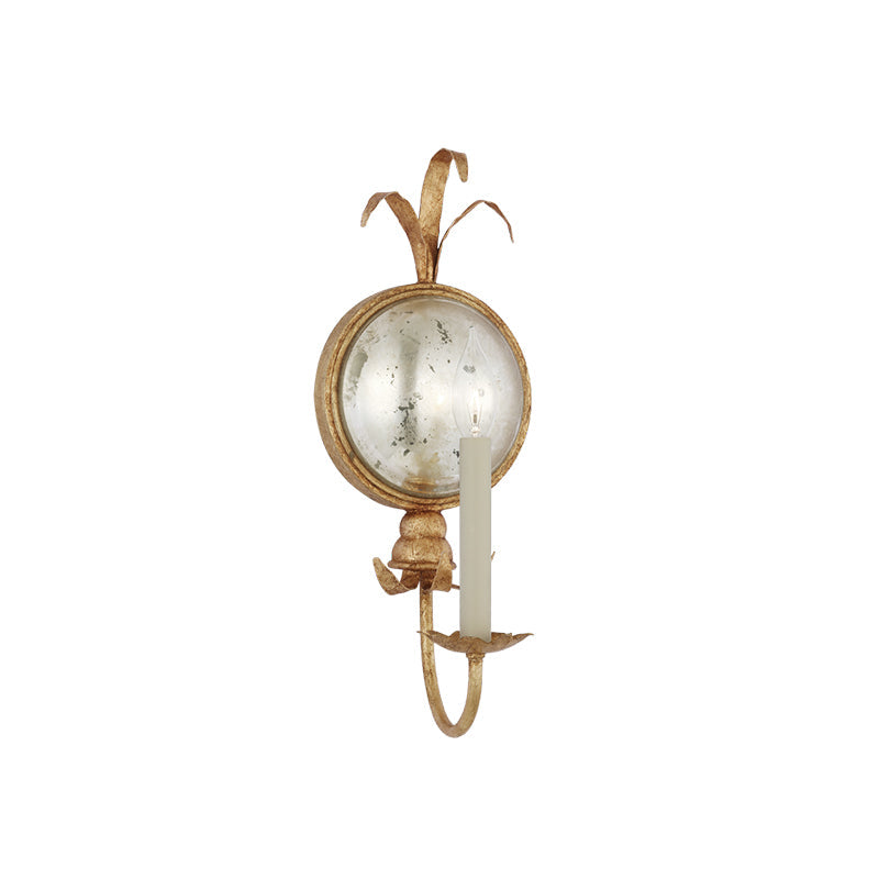 The Oculus Sconce captures the romance of a bygone era, designed to be a jewel-like accent for the traditional interior. Elegant brass arms curve gracefully upwards, presenting candelabra lights that flank a central, convex antiqued mirror. Finished in a distressed, gilded brass, this sconce is designed to create a warm, regal ambiance, playing with both direct and reflected light.