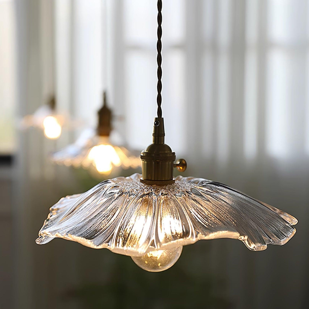 Bring a nostalgic, vintage-inspired charm to your ceiling with this floral glass pendant that feels like a treasured find from a mid-century estate. The scalloped, petal-like glass shade creates a gentle play of light and shadow, casting a warm, inviting glow that makes any room feel instantly more intimate. Rooted in a refined, art-nouveau aesthetic, it transforms functional lighting into a delicate piece of hanging art that elevates the mood of your entire home.