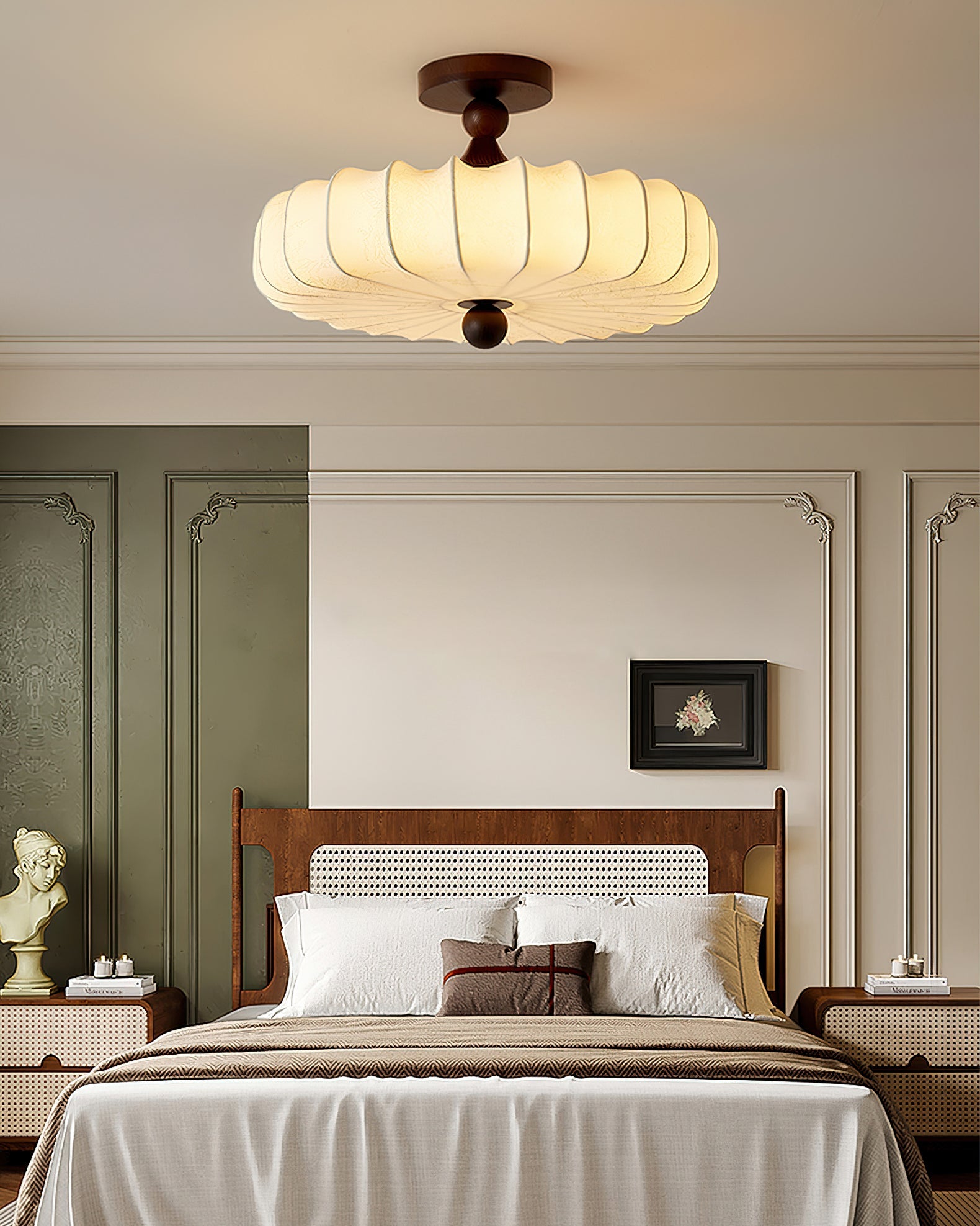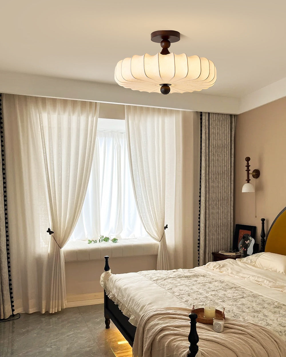 Contraste riche entre bois et tissu : Des accents en bois foncé ancrent l'abat-jour doux, créant un beau contraste de matériaux parfait pour les intérieurs Japandi ou transitionnels.
