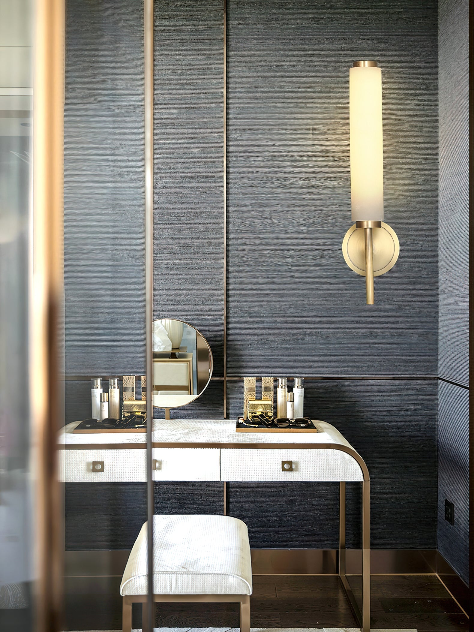 Créez une entrée sophistiquée en encadrant une console avec une paire d'appliques simples pour un accent vertical épuré. Utilisez l'applique double équilibrée au-dessus d'un canapé ou d'une cheminée pour servir de point focal architectural saisissant qui diffuse une lumière généreuse et accueillante.