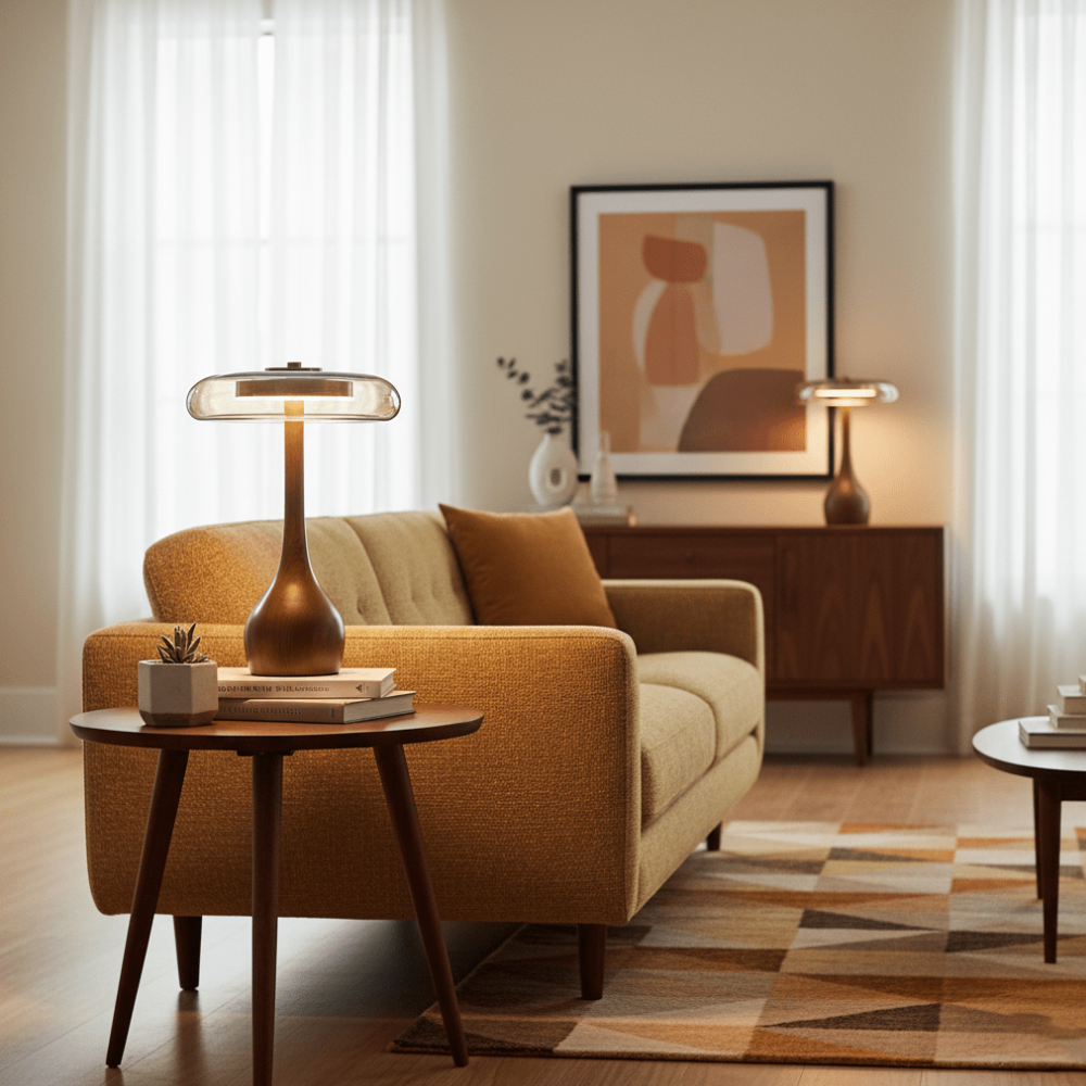 Esthétique ancrée dans le milieu du siècle : Le socle finition noyer et le verre ambre offrent un look vintage inspiré, à la fois ancré et très intentionnel.