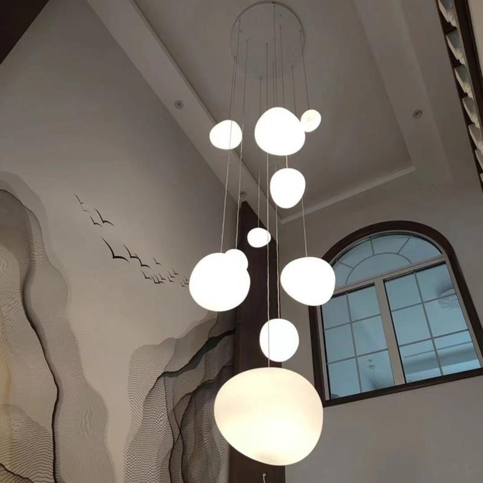 Ce pendentif saisissant serait un bel ajout suspendu au-dessus d'une table à manger minimaliste, créant une ambiance intime pour les repas. Il fonctionne également merveilleusement bien comme pièce maîtresse unique dans un salon, attirant le regard, ou peut-être qu'une paire pourrait encadrer un lit, offrant une touche douce et contemporaine à une chambre.