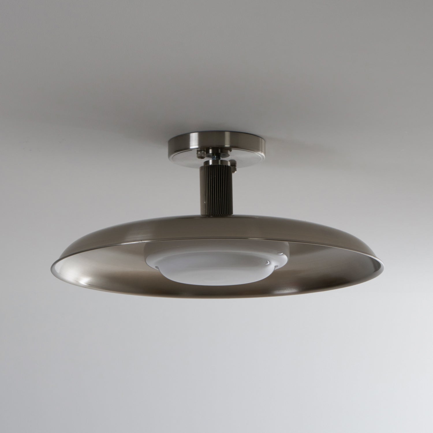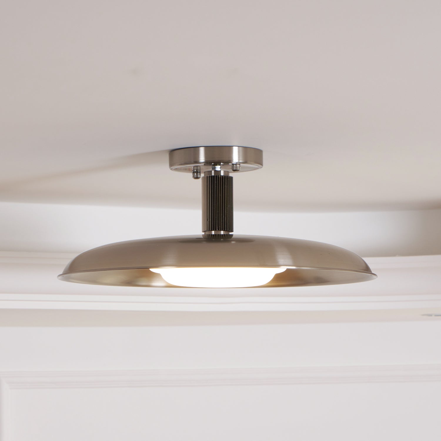 Expansive Disc Silhouette: The wide, low-profile metal shade makes a graphic statement, ideal for bringing a designed look to spaces with lower ceilings.