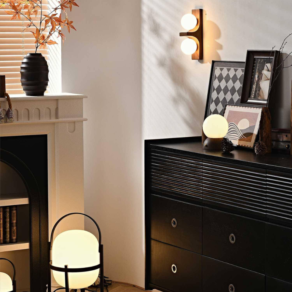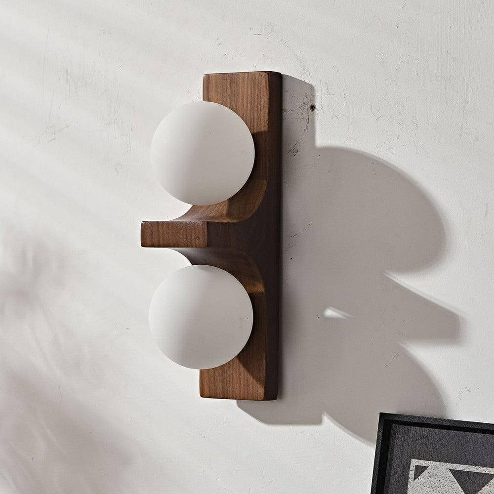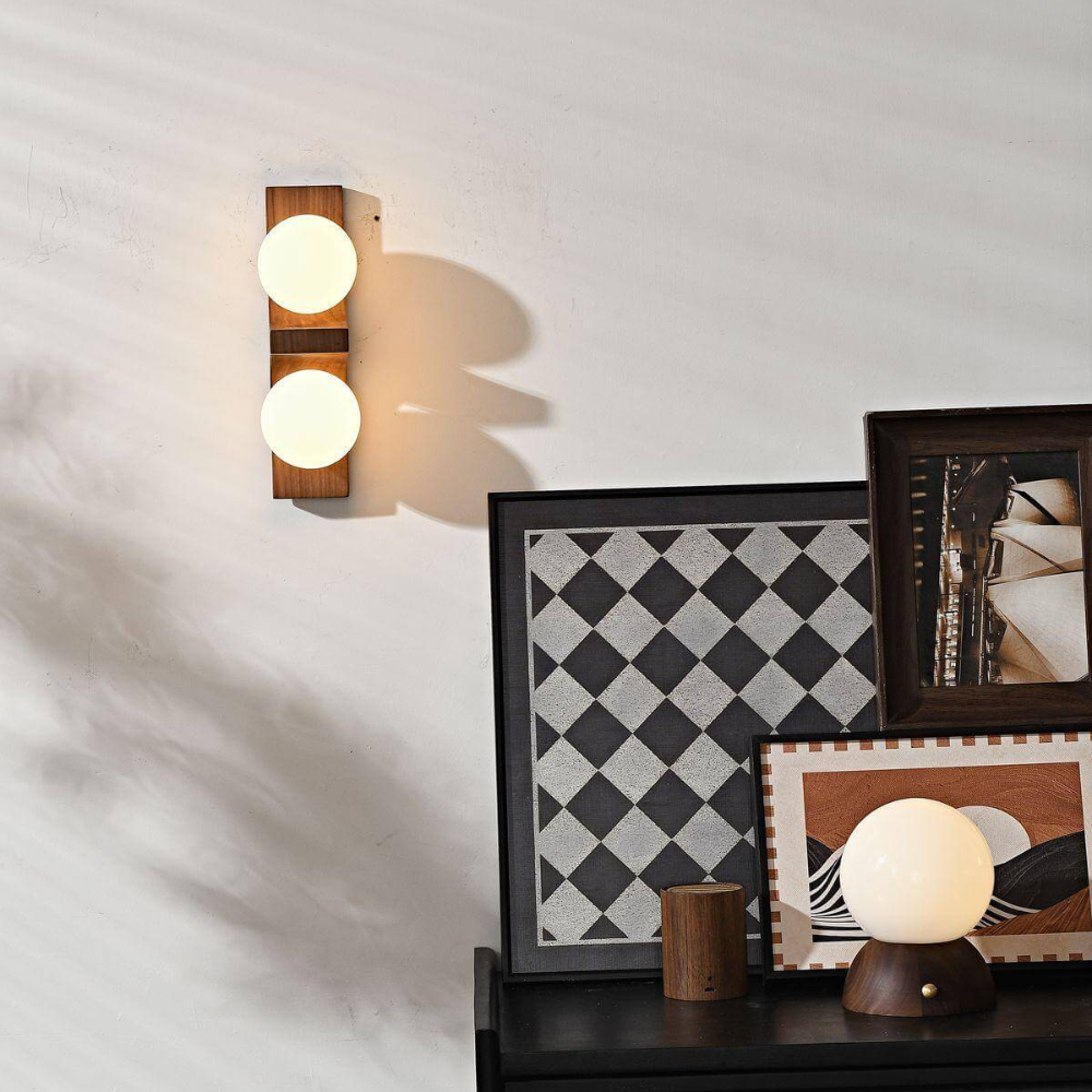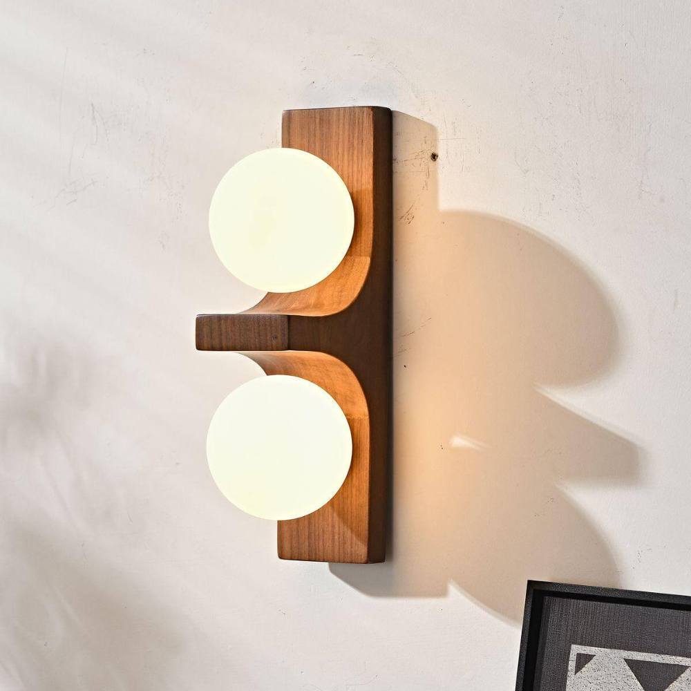 Bring a touch of storied, mid-century charm to your walls with this sculptural fixture that seamlessly blends natural warmth with a refined, geometric silhouette. Its design features two glowing glass orbs nestled into a carved walnut-toned base, creating a rhythmic and balanced presence that feels both nostalgic and fresh. Rooted in a quiet, retro-inspired aesthetic, this wall light provides a soft, inviting radiance, making it the perfect choice for adding a finishing touch of organic character to your living space.