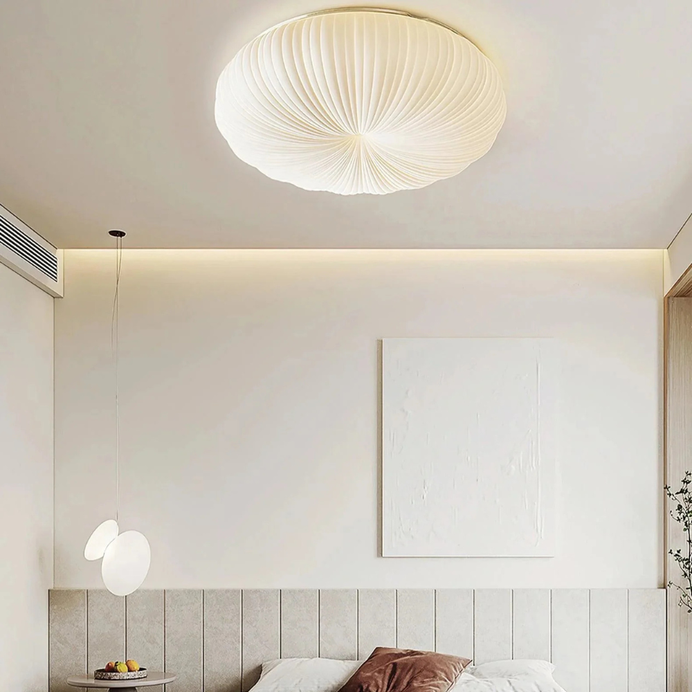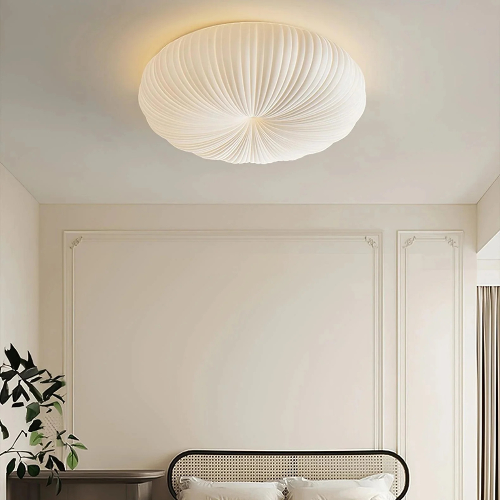Bring a sense of serene, sculptural beauty to your home with a fixture that draws inspiration from the delicate, pleated forms found in nature. This low-profile ceiling light features a soft, cloud-like silhouette with fine radial detailing that creates a sophisticated play of shadow and light across its surface. Rooted in a clean, Scandinavian aesthetic, it provides a warm and even glow that fills the room with a calm, inviting atmosphere, making it a beautiful centerpiece for a modern sanctuary.