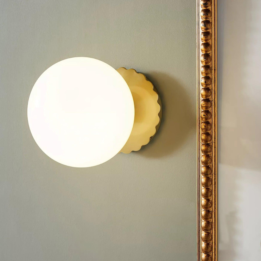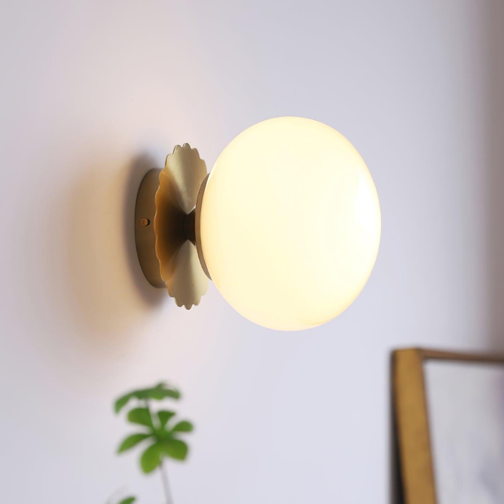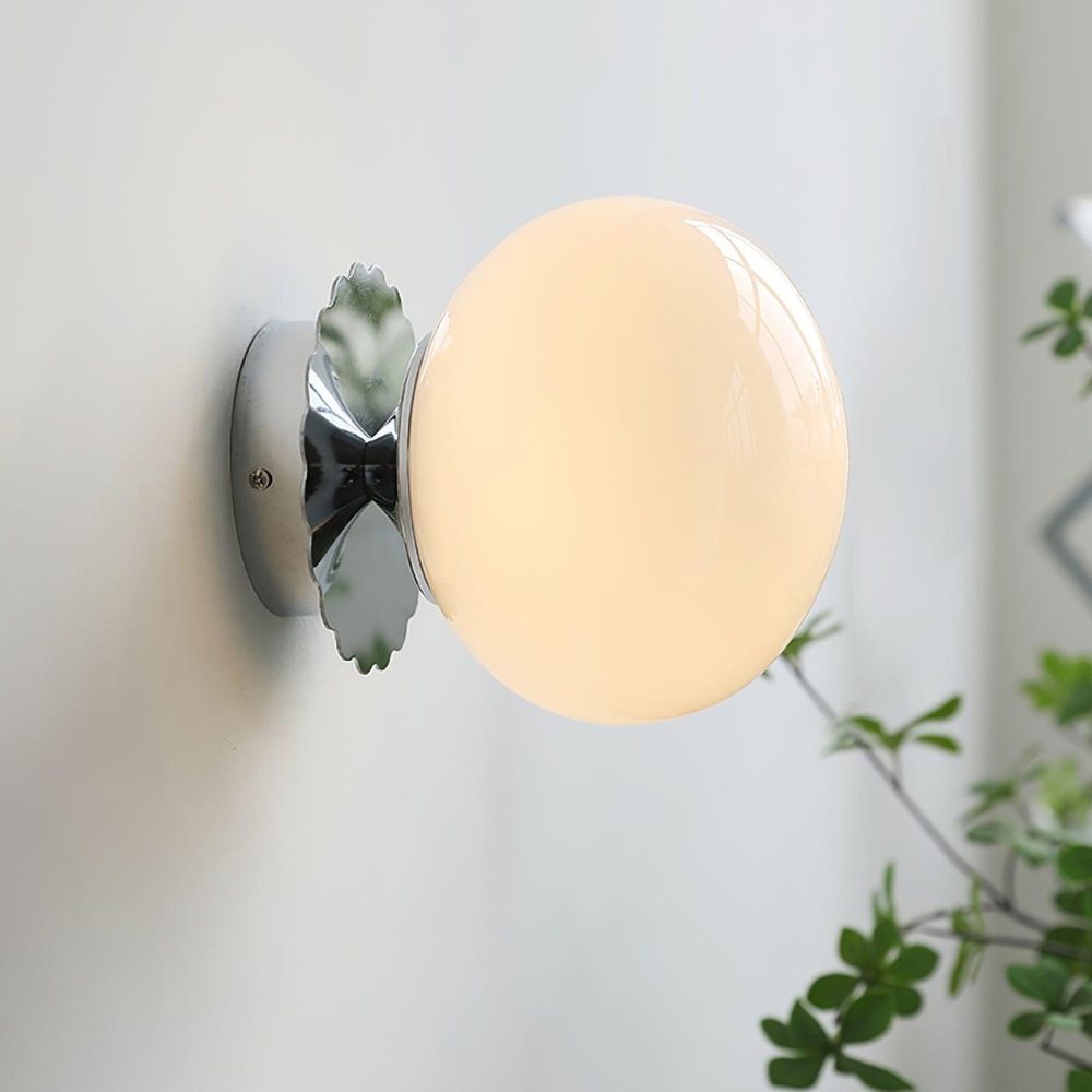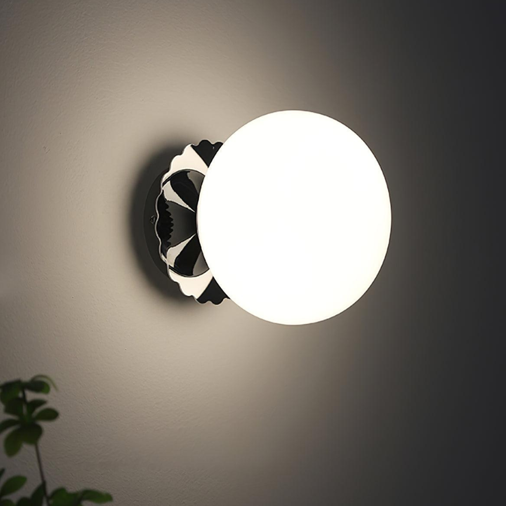Bring a touch of modern, art-deco-inspired charm to your home with this sculptural wall fixture that feels like a curated piece of functional art. Its design is defined by a soft, glowing glass orb that sits elegantly against a scalloped backplate, creating a rhythmic silhouette on your walls. Rooted in a refined, contemporary aesthetic, this light provides a warm and inviting radiance, making it a thoughtful choice for adding a finishing touch of sophisticated character to your living space.