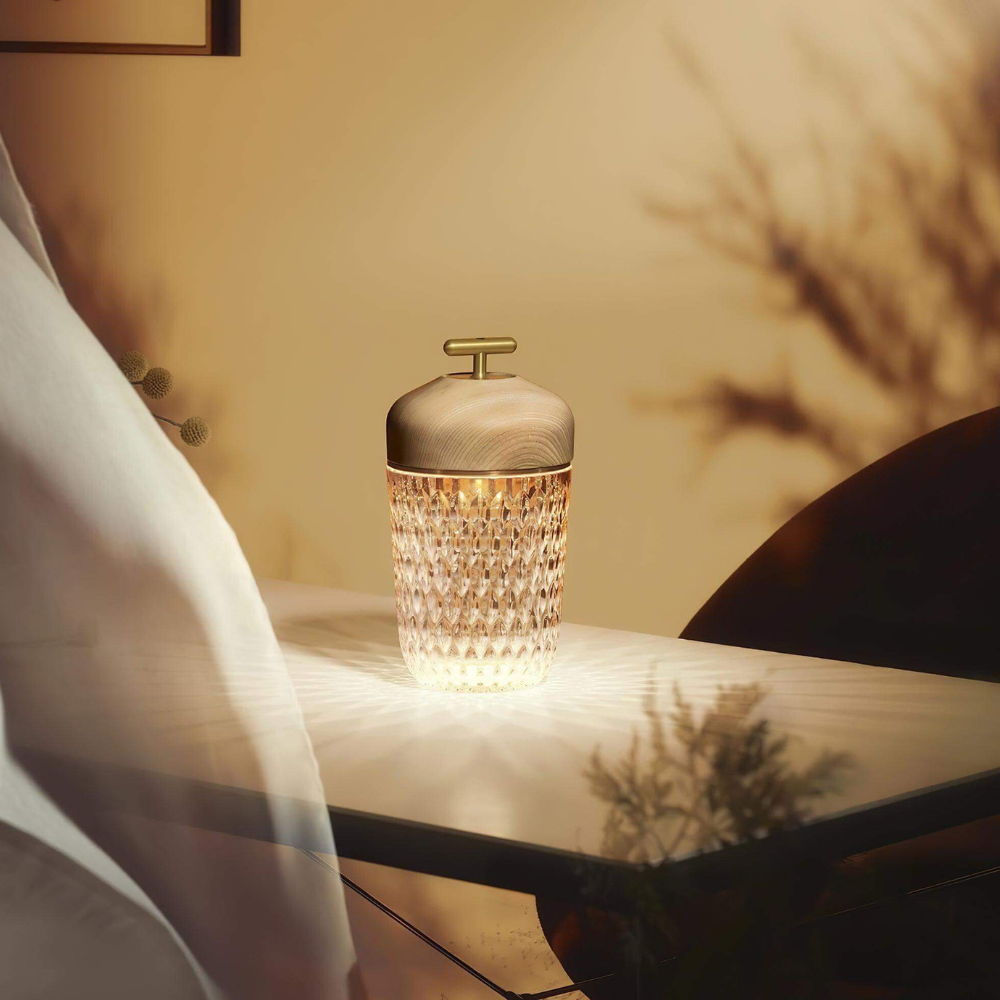Bring a sense of refined, portable brilliance to your home with this sculptural lantern that bridges the gap between classic artistry and modern convenience. Its crystalline body is etched with intricate patterns that catch and refract light, casting a mesmerizing, starburst-like radiance across your surfaces for a truly atmospheric experience. Designed to be carried from a quiet reading corner to an evening gathering, this cordless light transforms any setting into a curated, glowing sanctuary with a simple touch.