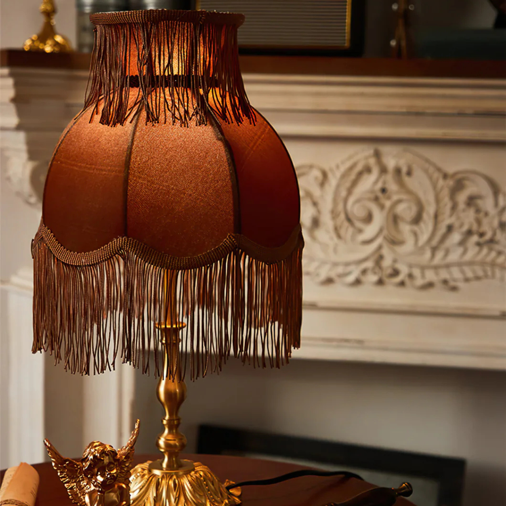 Bring a touch of timeless, romantic charm to your home with a design that celebrates vintage opulence and tactile richness. The gracefully curved base sits elegantly beneath a bell-shaped fabric shade adorned with delicate fringe, creating a sophisticated silhouette that feels like a treasured find. Rooted in a classic, traditional aesthetic, this decorative lamp provides a soft, atmospheric glow, perfect for adding a finishing touch of regal character to your evening sanctuary.